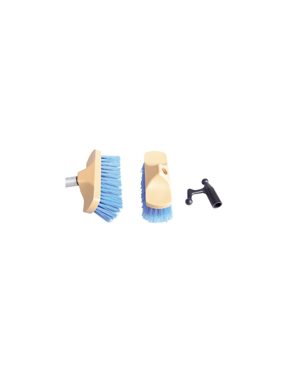 Dek borstel set bestaande uit een aluminium geanodiseerde telescopische steel, een harde borstel, een zachte borstel en een opschroefbare bootshaak. Door het afgeronde en compacte formaat van de borstels zijn deze ook zeer goed te gebruiken in de gangboorden. De steel is instelbaar van 65-122cm.