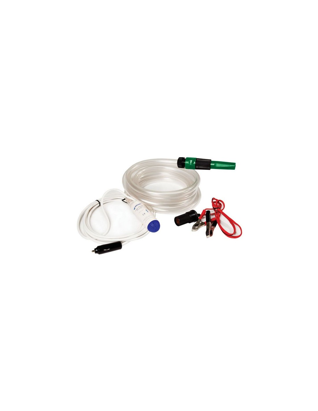 Dompelpomp met 3,75 meter slang (geschikt voor drinkwater) en 3,75 meter kabel met 12 V plug en krokodillenklem.