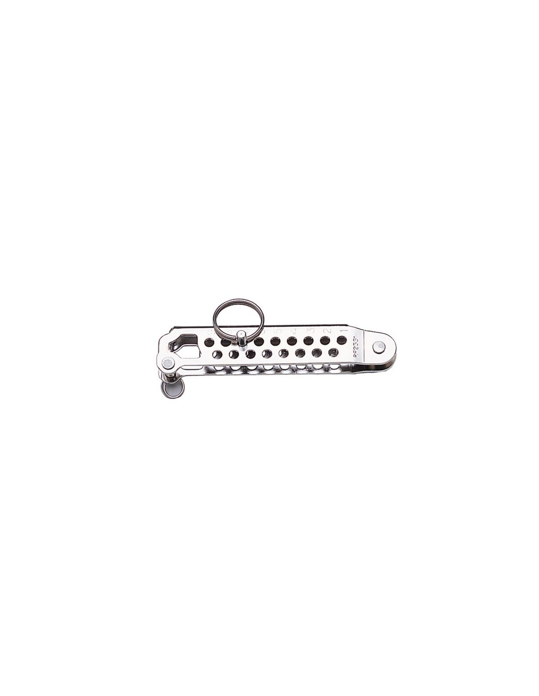 RVS 316. Per 4 mm verstelbaar over lengte van 64 mm. Totale lengte 115 mm voorzien van 2 borstbouten X 4,7 mm en snelpen X 4,7 mm. Max. stagdikte 3 mm.