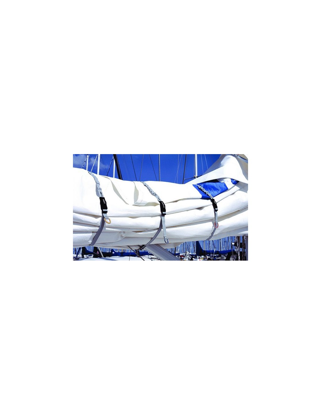 • Het slimme ontwerp maakt gebruik van webbing met daarin elastiek. Hierdoor spant het zeilbandje zich goed om het zeil nadat deze vastgeklikt is.